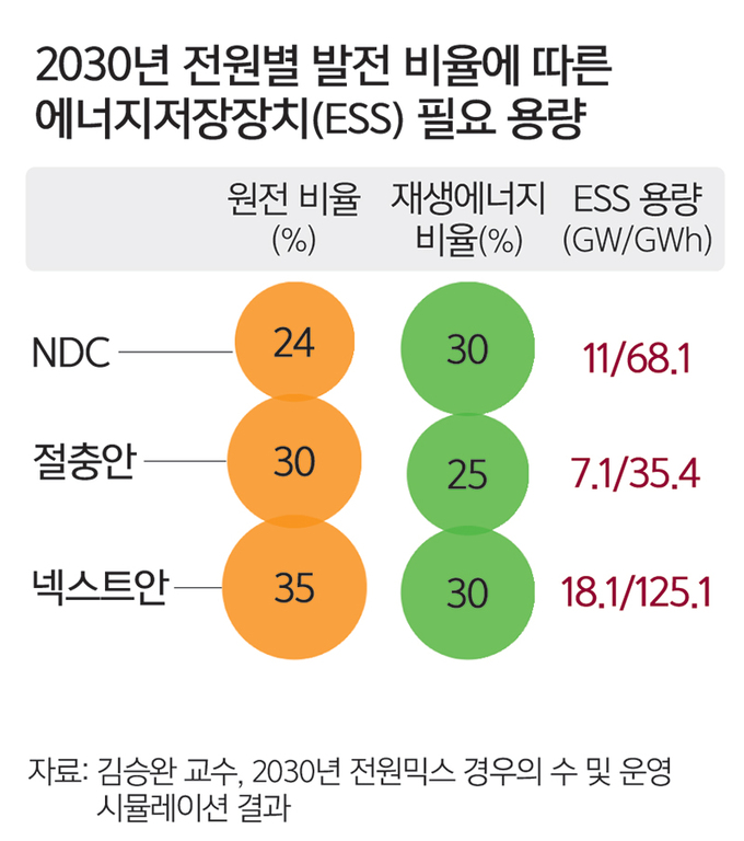 에너지·환경정책 싱크탱크 사단법인 넥스트 대표인 김승완 충남대 교수(전기공학과)는 가능하다는 입장이다. 김 교수가 진행 중인 연구에 따르면 2030년 기준 전원믹스(전원별 구성 비율) 방안에 따라 모의 시험한 결과, ESS(에너지저장장치)를 활용하면 현재보다 원전과 재생에너지를 모두 늘릴 수 있다는 결론을 얻었다.
