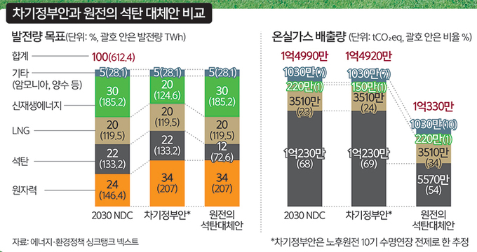 넥스트 보고서는 새 정부가 원전을 늘리는 만큼 추가 확보한 발전량으로 신재생에너지가 아닌 석탄 발전을 대체한다면 우리나라의 발전부문 온실가스 배출량을 현 목표치보다 30% 이상 줄일 수 있다고 강조한다.