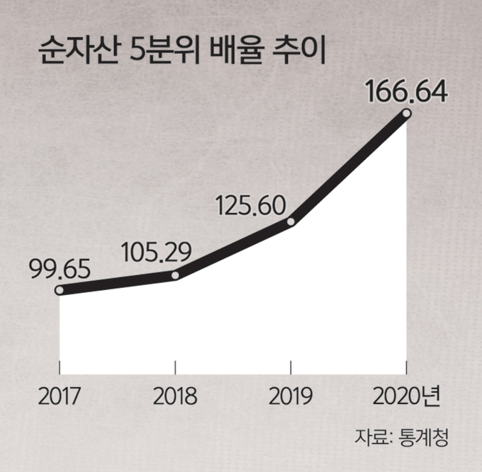 상위 20%(5분위) 가구의 평균 순자산을 하위 20%(1분위)의 평균 순자산으로 나눈 값인 ‘순자산 5분위 배율’도 2017년 99.65배에서 지난해 166.64배로 크게 뛰었다. 지난해 3월 5분위 가구의 평균 순자산은 11억2481만원으로 1분위 가구(675만원)보다 11억1000만원 이상 많았다. 이러한 통계지표는 올해 더욱 악화될 것으로 전망된다.