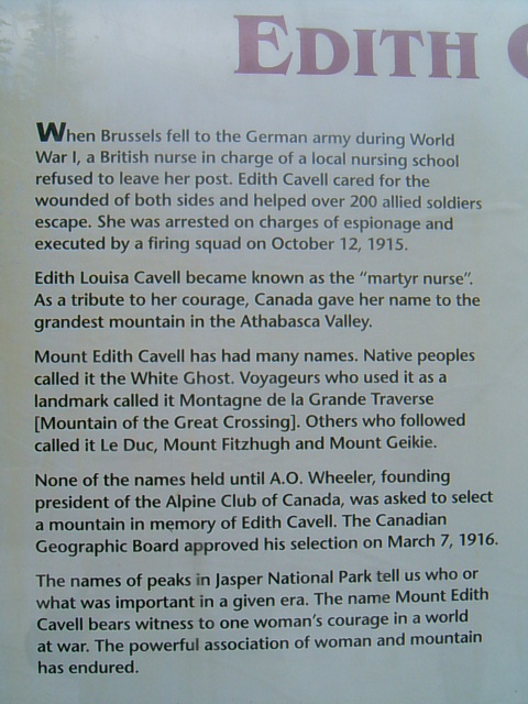 에디스 까벨산의 명칭이 어디에서 유래됐는지 설명하고 있다. 영국 간호사였던 까벨은 제1차 세계대전 당시 브뢰셀이 독일의 점령지가 됐을 때 브뢰셀을 떠나라는 영국 정부의 명령을 거부하고 영국과 독일 병사를 모두 치료해줬는데 그 때문에 1915년 간첩죄로 총살형을 당했다고 한다. 까벨은 '순교자'가 됐고 캐나다가 그녀의 용기를 기리기 위해 이 산에 그녀의 이름을 붙였다.