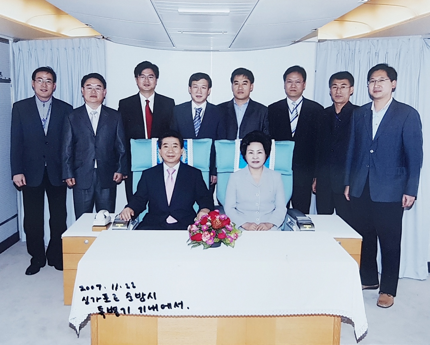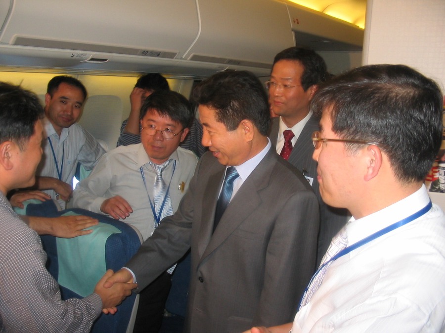 노 대통령은 종종 순방국으로 향하는 전용기 안에서 청와대 출입기자들과 인사를 나누곤 했다. 노 대통령과 악수하고 있는 필자.
