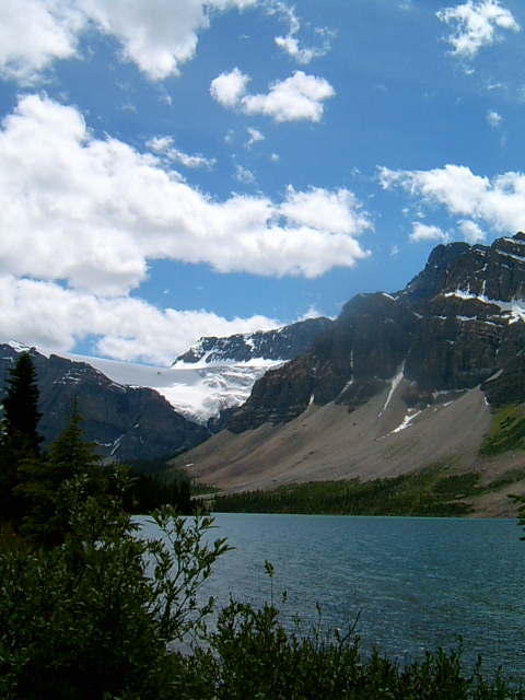 보우 호수 남동쪽 끝에서 바라본 Crowfoot Mt, Tompson Mt, Bow Glacier.