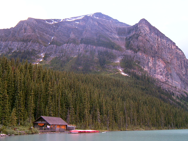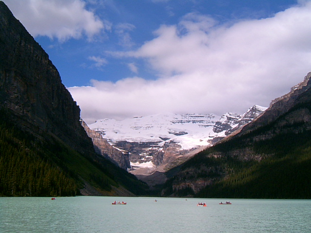 레이크 루이스 윗편에 위치한 빅토리아 빙하는 200만년 전에 산을 깎아서 협곡을 만들었다고 합니다. 그리고 1만년 전에 빙하가 녹으면서 뒤로 후퇴해 지금의 레이크 루이스 호수를 만들었다고 한다. 최근의 기후온난화 현상이 빙하가 녹는 속도를 가속화시켜서 언젠가는 빅토리아 빙하가 다 사라질 수도 있다는 관측이다.