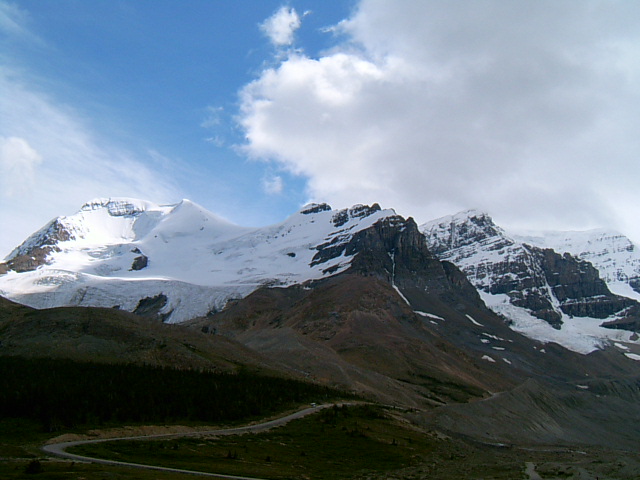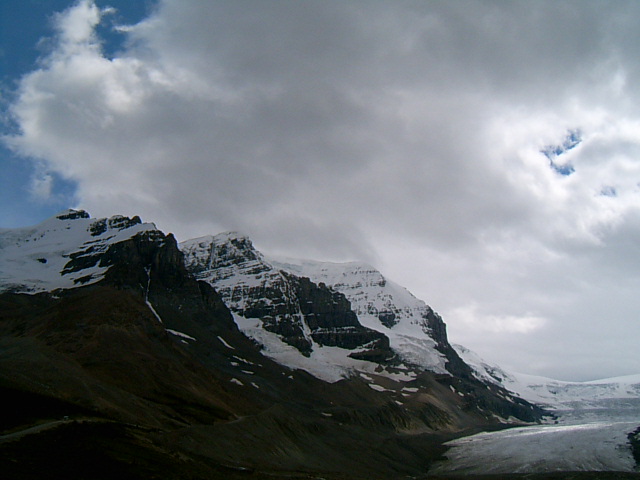 멀리 사스카치완(Saskatchewan) 빙하가 보인다. 사스카치완 빙하는 콜럼비아 빙원(Icefield)의 일부다. 콜럼비아 빙원을 이루는 빙하들 중에서 가장 길다.