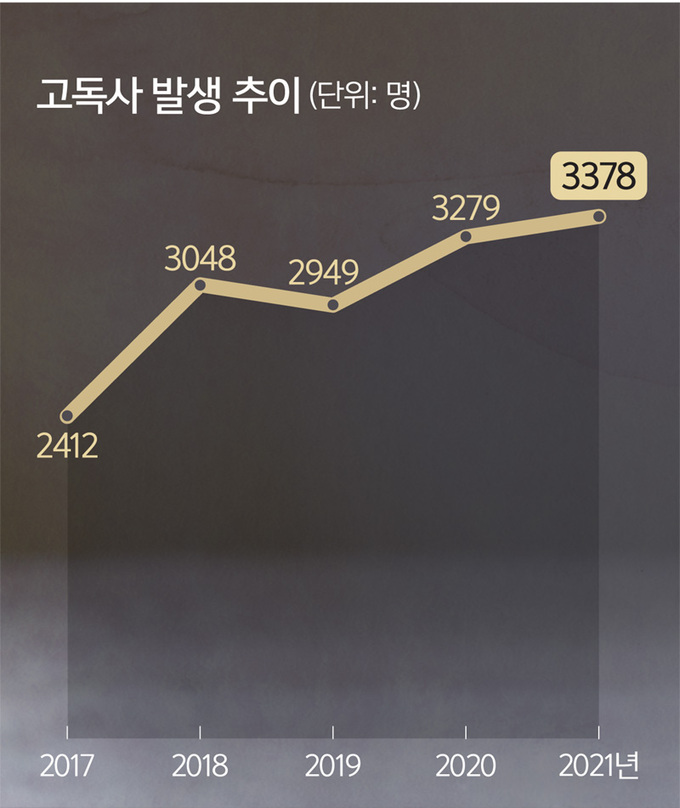 누구나 죽음 앞에서는 평등하지만 마지막 모습은 천차만별이다. 가족과 사회의 배려 속에서 떠나가는 죽음이 있는가 하면 홀로 죽어 뒤늦게 발견되는 외로운 죽음도 있다. ‘고독사(孤獨死)’다. 우리 법 시스템은 이를 ‘가족, 친척 등 주변 사람들과 단절된 채 홀로 사는 사람이 자살·병사 등으로 혼자 임종을 맞고, 시신이 일정한 시간이 흐른 뒤에 발견되는 죽음’으로 정의한다. 나날이 늘어가는 이 문제에 보건복지부는 지난해 12월 처음 실태조사 결과를 발표했다. 이에 따르면 2021년 발생한 고독사는 3378명. 2017년 2412명에 비해 40%나 늘었다. 한 해 사망자가 30여만명인 것을 고려하면, 사망자 100명 중 1명은 쓸쓸한 죽음을 맞이하고 있는 셈이다.