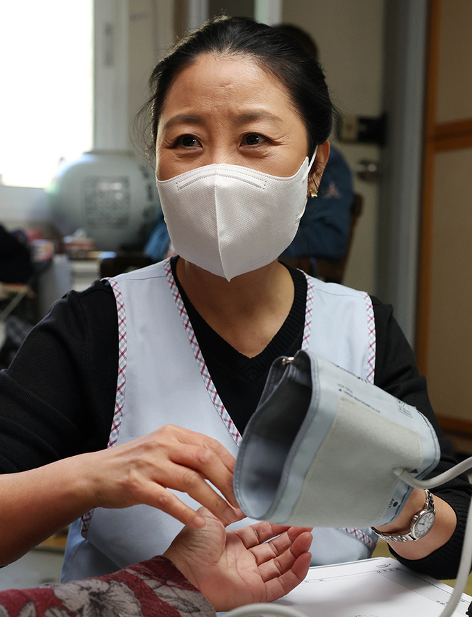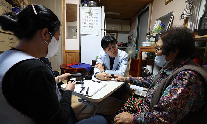 옆에서는 최희선 간호사가 김씨 남편 민제근(77)씨의 혈당을 체크하고 있었다. 당 수치가 조금 높게 나오자 “점심을 몇 시에 뭘로 드셨느냐”고 물었다. 진료 전에 커피와 탄산음료를 섭취했다는 말에 “그러면 당이 높아진다”고 타박했다. “관절도 좋지 않은데 주변 친구나 가족들 불러 하는 식사 자리도 좀 그만 만들라”는 말도 했다. 이번이 열여섯 번째 방문이라 그런지 이들은 이 집 사정을 매우 잘 아는 눈치였다.