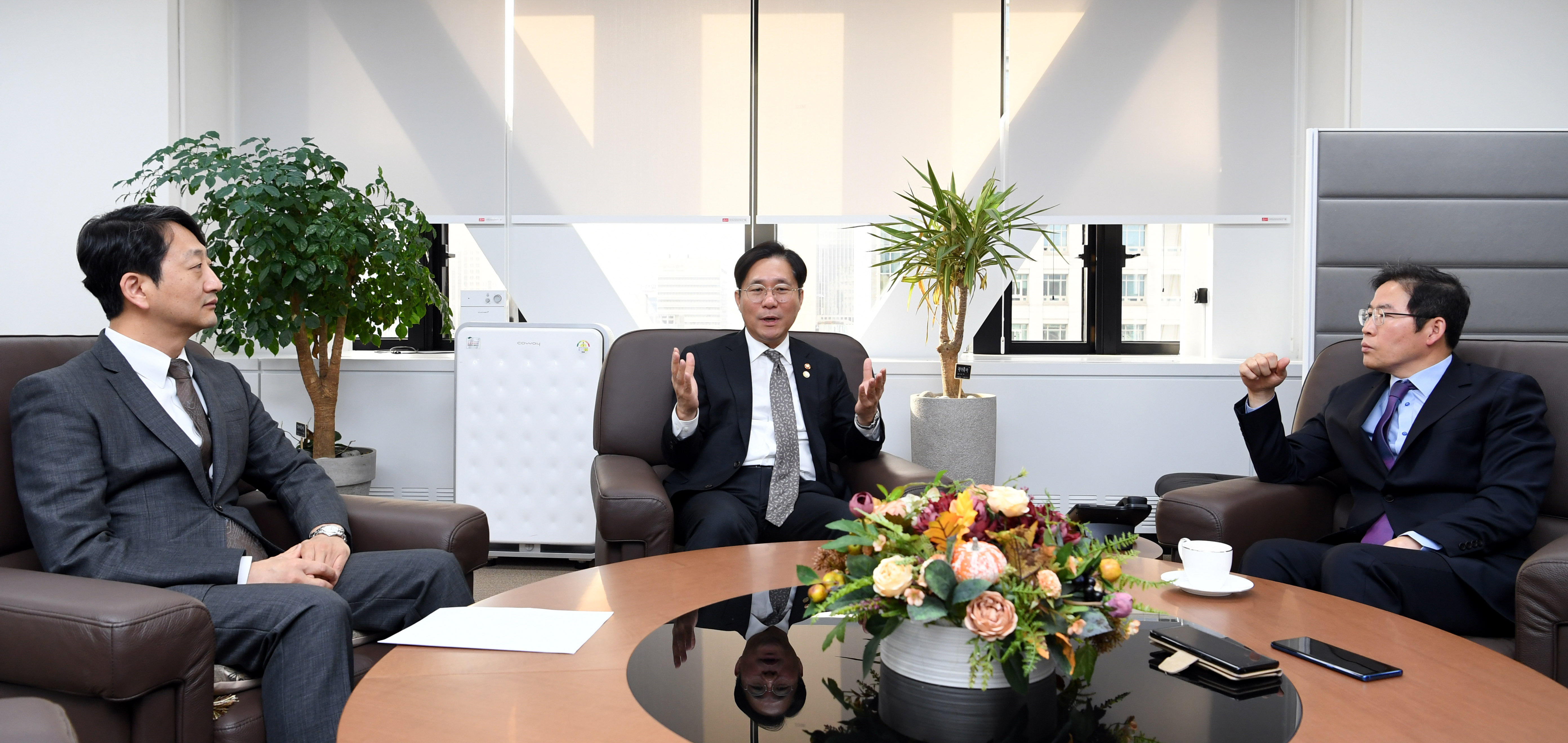 성윤모 산업통상자원부 장관(가운데)과 안덕근 서울대 국제대학원 교수(왼쪽)가 지난 18일 서울 종로구 세종로 정부서울청사 외빈접견실에서 한·아세안 경제협력 방안 등을 주제로 대담하고 있다. 남정탁 기자