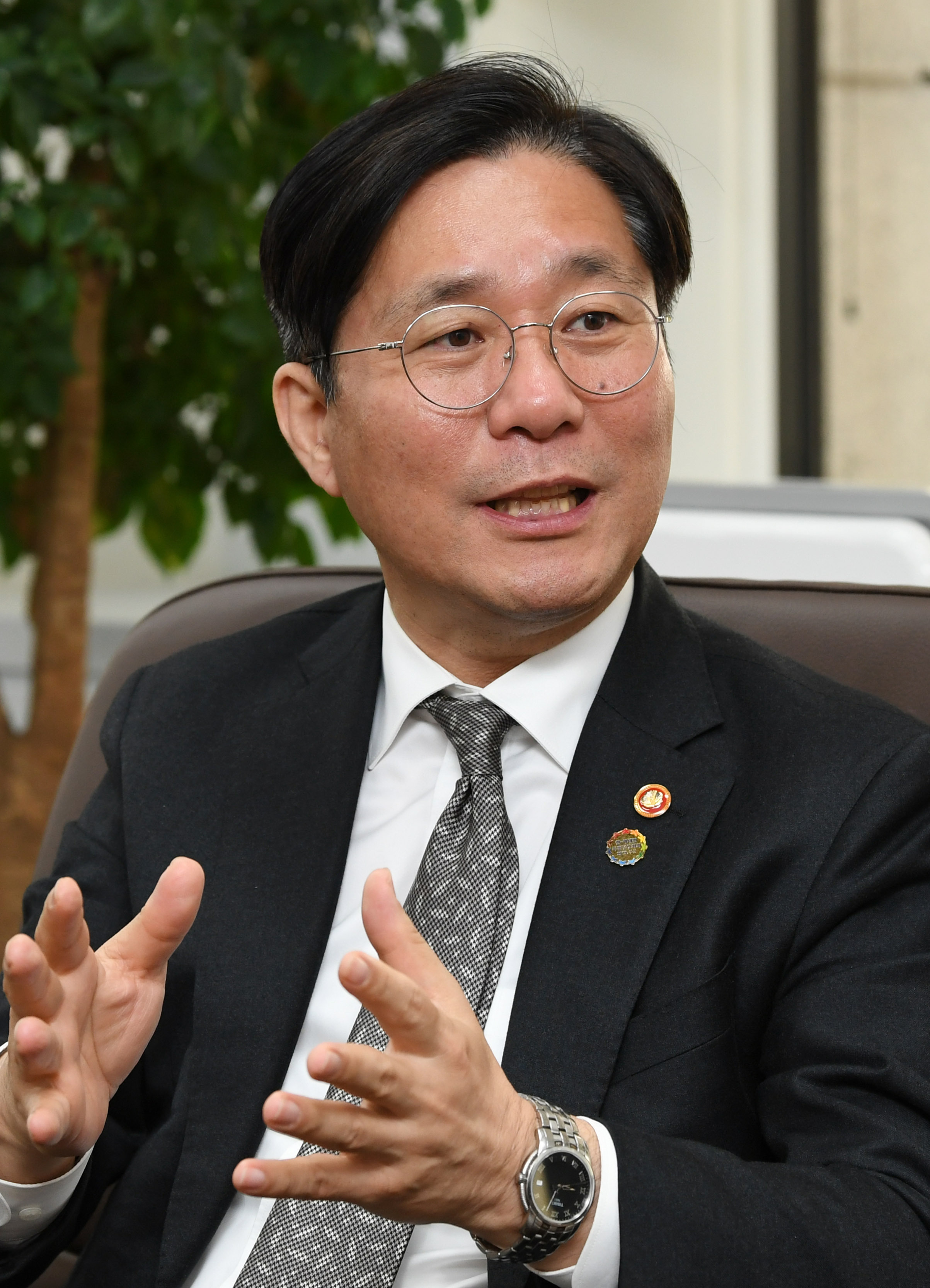 성윤모 산업통상자원부 장관은 세계일보가 20일 개최하는 ‘2019 세계아세안포럼’ 관련 특별 대담에서 “자금이나 인력 등 가용 자원이 경쟁국에 비해 제한되어 있지만 우리보다 앞서 아세안에 진출한 일본, 중국과의 경쟁에서 이길 수 있도록 정교한 전략을 수립, 추진해나가겠다”고 말했다. 성 장관과 안덕근 서울대 국제대학원 교수의 특별 대담은 지난 18일 서울 종로구 세종로 정부서울청사 외빈접견실에서 조남규 세계일보 산업부장의 사회로 진행됐다.