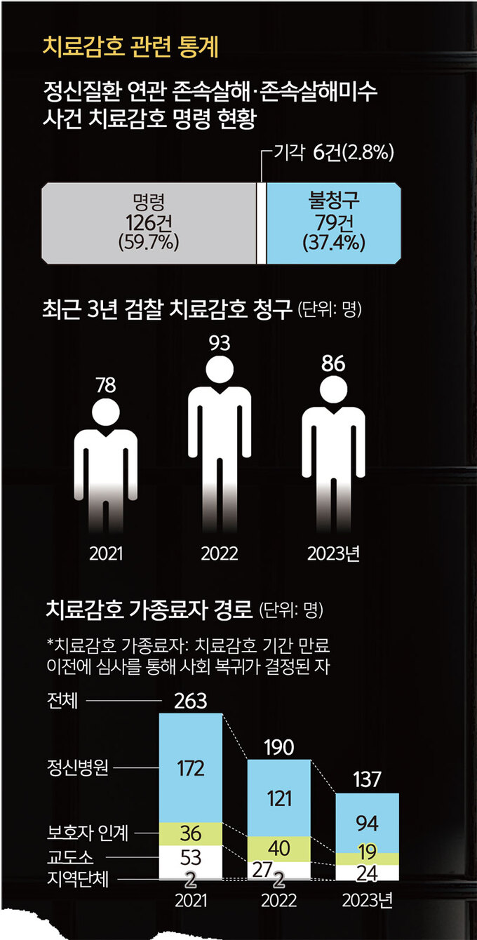 28일 세계일보는 최근 10년간(2014∼2023년) 존속살해와 존속살해미수 혐의로 진행된 판결 823건(열람제한 제외 전수)을 분석했다. 이 중 정신질환과 연관성이 인정된 존속살해·존속살해미수 사건 211건(1심 기준)을 살펴본 결과 상급심까지 치료감호가 청구된 경우는 59.7%(126건)에 그쳤다. 가족의 테두리 안에서 치료받을 여건이 안 된다면 국가가 보호하고 치료할 필요성이 있지만, 실상은 그렇지 못하다.