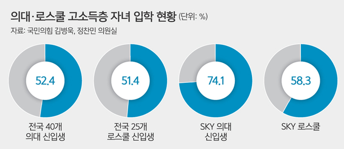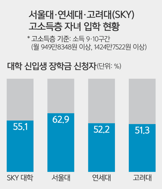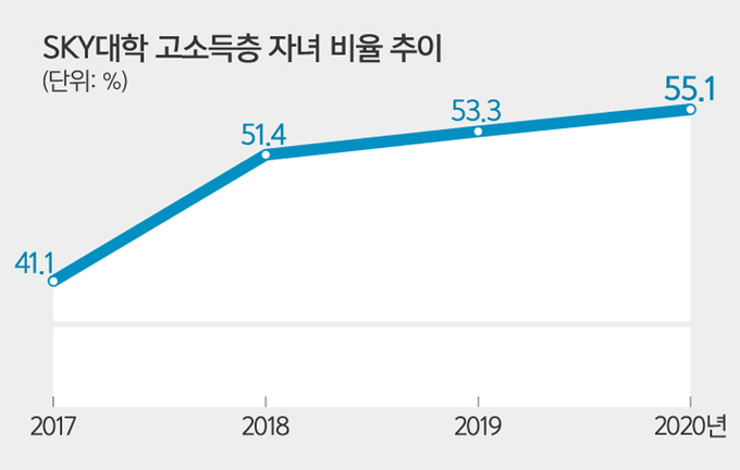 로스쿨뿐만 아니라 명문대 진학에도 부모의 부가 큰 영향을 끼치고 있다는 통계도 수두룩하다. 정찬민 국민의힘 의원이 공개한 자료에 따르면, 2020년 1학기 SKY대학 신입생 중 장학금 신청자를 대상으로 소득구간을 나누자 9·10구간이 55.1%를 차지했다. 2017년 SKY 대학의 고소득층 비율은 41.1%에 그쳤지만 2018년 51.4%, 2019년 53.3%, 2020년 55.1%로 해마다 상승세다.