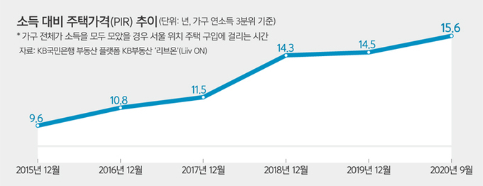 월급을 한 푼도 쓰지 않고 숨만 쉬고 살며 모아도 서울에서 아파트 한 채를 마련하려면 15.6년이 걸린다는 분석도 있다. KB국민은행 부동산 플랫폼 KB부동산 ‘리브온’(Liiv ON)에 따르면 지난 9월 말 기준 서울 3분위 가구(2인이상·도시가구)의 소득 대비 주택가격(PIR)은 15.6으로 2008년 조사가 시작된 이후 가장 높았다. PIR은 주택가격을 가구 소득으로 나눈 값으로, 가구 전체가 소득을 한 푼도 쓰지 않고 모았을 경우 주택을 구입하는 데 걸리는 기간을 뜻한다.