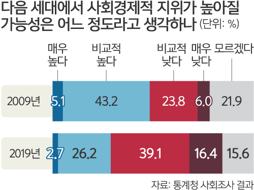 통계청의 사회조사에 따르면 2009년만 해도 ‘다음 세대(자식 세대)에서 사회·경제적 지위가 높아질 가능성’에 대해 긍정적인 응답이 48.3%, 부정적인 응답이 29.8%, 모르겠다는 응답이 21.9%였다.