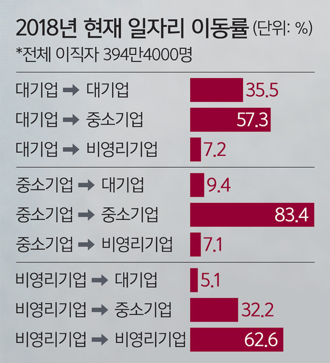 정규직과 비정규직의 사이가 멀어지고 있다. 급여 수준과 사회보험 가입률 등 격차가 확대되면서 직업 안정성도 양극화로 치닫고 있다. 문재인정부 들어 기업 규모를 막론하고 비정규직의 정규직 전환 비율은 지난해 상반기에 가장 낮았다. 중소기업에서 대기업으로 직장을 옮기는 근로자는 10명 중 1명이 될까 말까 했다. 노동 사다리가 붕괴됐다는 우려가 나오는 이유다.