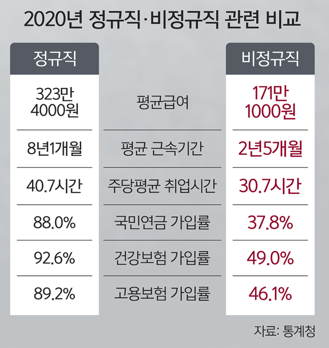 사회보험 가입률이나 근로복지 수혜율에서도 격차가 커졌다. 2019년 정규직의 국민연금 가입률은 87.5%에서 2020년 8월 88.0%로 0.5%포인트 늘었지만, 같은 기간 비정규직의 가입률은 37.9%에서 37.8%로 0.1%포인트 줄었다. 또 퇴직급여를 받는 정규직은 91.7%에서 91.9%로 0.2%포인트 증가한 반면 비정규직의 경우 42.9%에서 40.4%로 2.5%포인트 낮아졌다. 지난해 상여금 역시 정규직은 86.6%가 받은 데 비해 비정규직은 37.6%만 받았다. 1년 전보다 정규직은 0.2%포인트 늘었고 비정규직은 0.6%포인트 감소했다.
