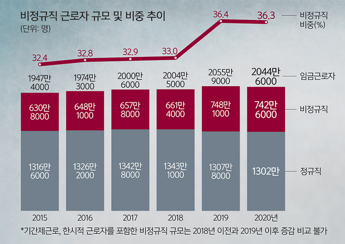 정규직과 비정규직의 급여 차이도 해마다 벌어지고 있다. 경제활동인구조사를 보면 2019년 6~8월 정규직의 평균 월급은 316만5000원이었지만 비정규직은 172만9000원이었다. 1년 뒤인 지난해 같은 기간 평균 급여의 경우 정규직은 323만4000원으로 6만9000원이 늘어난 반면 비정규직은 1만8000원 줄어든 171만1000원으로 조사됐다. 두 일자리의 급여 차이가 143만6000원에서 152만3000원으로 1년 새 8만7000원 벌어졌다. 2017년 비정규직과 정규직 급여 차이는 129만1000원이었다.