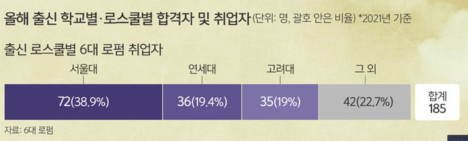 올해 6대 로펌(김앤장·태평양·세종·광장·율촌·화우)에 입사한 187명의 신입 변호사 중 SKY 로스쿨 출신은 143명이나 됐다. 사법연수원 출신 2명을 제외하면 전체 신입 변호사 10명 중 약 7명(77.3%)이 SKY 출신이었다. 학교별로는 서울대가 72명(38.9%)으로 가장 많았고, 연세대(36명·19.4%), 고려대(35명·19%)가 뒤를 이었다. 대형 로펌은 검사·로클럭(재판연구원)과 함께 로스쿨생이 가장 원하는 취업지다.