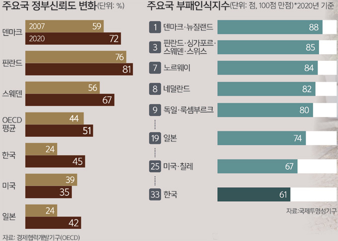 덴마크인들은 정부가 나라를 공정하게 이끈다고 믿는다. OECD에 따르면 지난해 덴마크의 정부신뢰도는 72%로 한국(45%)의 1.6배에 달한다. 국가청렴도는 같은 해 100점 만점에 88점으로 세계 1위를 차지했다. 이는 덴마크가 높은 세금을 부과하고 사회복지 정책을 펼칠 수 있는 선순환의 원동력이다. 벤트 그레우 로스킬데대 교수(사회과학)는 “모든 시민이 공정하게 교육받을 수 있도록 하는 등의 품질 좋은 사회복지시스템은 국민들이 사회를 공정하다고 여기게 만든다”고 설명했다.