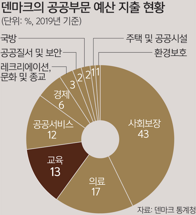 덴마크 청년들은 폭넓은 직업 선택의 자유를 누리고 있다. 정부와 사회에 대한 높은 신뢰도, 복지정책을 통해 줄어든 직업 간 격차 덕분이다. 덴마크는 평균적으로 소득의 40%대를 세금으로 거둬 직업별 소득 보존 등 적극적인 소득재분배 정책을 펼치고 있다. 이렇게 조성한 재원 덕분에 우리나라의 유치원 막학기에 해당하는 0학년부터 대학원 석사까지 전 교육과정이 무료다. 대학에 입학하면 정부에서 매달 국가교육지원금(SU)이 나온다. 학생들이 학비·생활비 걱정 없이 공부에 전념할 수 있는 환경인 셈이다.