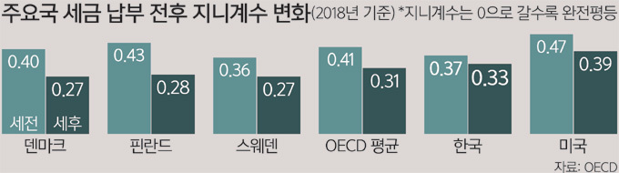 경제협력개발기구(OECD)가 계층간 소득불균형 정도를 0(완전평등)과 1(완전불평등)을 기준으로 나타내는 ‘지니계수’를 활용해 2018년을 기준으로 덴마크를 분석한 결과 세금이 부과된 전후 지니계수는 0.40에서 0.27로 0.13%포인트가량 격차가 줄었다. 한국의 지니계수는 같은 기간 세전 0.37에서 세후 0.33으로 0.04%포인트가 변했다.
