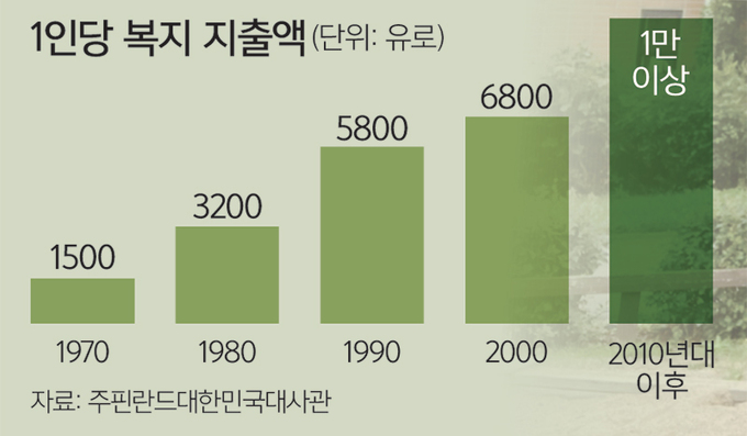 신 연구원은 핀란드의 복지 점수를 10점 만점으로 뒀을 때 최고점에 가깝다고 평가했다. 그는 “당장 계량화하긴 힘들지만 복지의 관대성과 포괄성 등을 종합하면 핀란드의 복지 점수는 만점에 근접하다”면서 “아직 한국의 복지 점수는 경제협력개발기구(OECD) 회원국 중 하위 15~20% 수준에 머물고 있다”고 봤다.