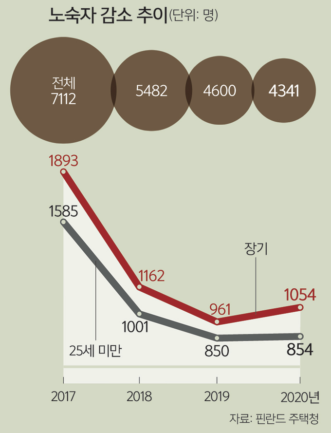 ARA는 지자체, 비영리 민간단체와 사회적 약자인 노숙인을 발굴해 사회주택을 제공한다. 이런 노력을 뒷받침하듯 실제로 핀란드의 노숙인은 감소세다. 2017년 7112명에서 2018년 5482명, 2019년 4600명, 지난해 4341명으로 매년 노숙인이 줄고 있다.