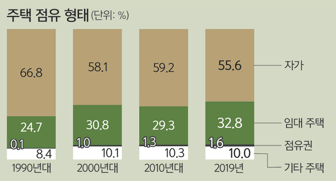 핀란드의 주택 비율은 개인이 소유한 자가는 줄어든 반면 임대주택은 늘었다. 1990년대 자가 거주자는 66.8%였으나 2019년에는 55.6%로 줄었다. 사회주택과 같은 임대주택은 1990년대 24.7%에서 2019년 32.8%로 증가했다.