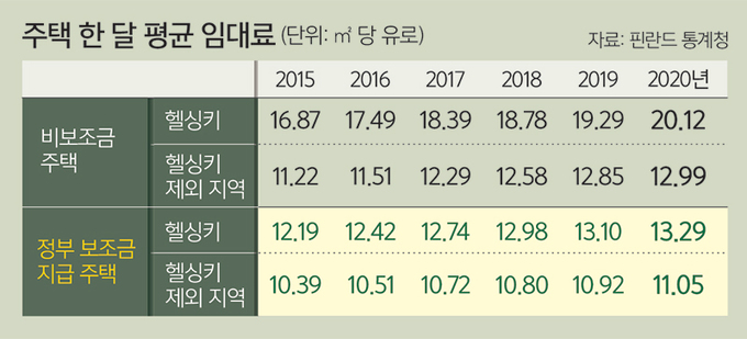 핀란드 정부는 주거 불평등의 문제를 ‘사회주택’으로 풀어냈다. 저소득층과 노숙인, 장애인, 청년, 노인 등에게 저렴한 임대료로 집을 공급한다. 월세를 내지 못하는 사람은 홈리스가 되지 않도록 지자체에서 600유로의 주택보조금을 준다. 이 때문인지 핀란드 길거리에선 구걸하는 사람을 찾아보기 힘들다. 있다고 해도 다른 유럽연합(EU) 국가에서 온 집시들이다.