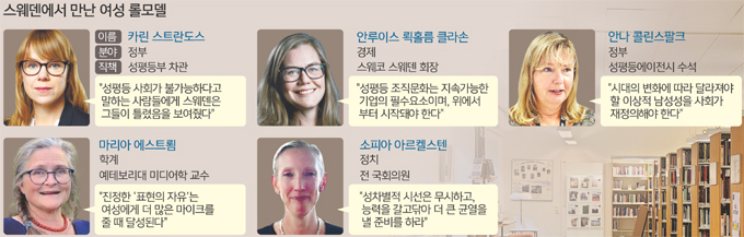 이러한 변화를 위해 여성과 남성 모두 이전과는 달라져야 했다. 여성은 정치·경제적 힘을 길러 자립 능력과 가정 내 동등한 권리를 획득했다. 지난해 기준 스웨덴은 장관급 직책 여성이 57%, 여성 의원 47%, 대기업 여성이사 비율 39% 등을 달성했다. 이 같은 지표를 통합한 성평등 권력(power)지수는 100점 만점에 84.2점을 받아 유럽 국가 중 월등한 1위다. 반대로 남성은 육아·가사 등에 적극적으로 참여하며 일·가정 양립의 지속가능성을 높였다. 레나 벵네루드 예테보리대 교수(젠더학)는 이런 단계에 도달하려면 “여성들은 더 많이 주장하고 쟁취해야 하며 남성들은 이를 잘 듣고 지지하는 역할을 해야 한다”고 말했다.
