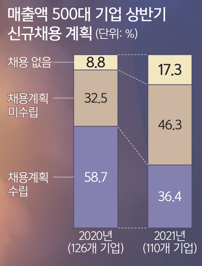 상시 채용은 기업 상황에 따라 아예 신규 인력을 뽑지 않을 수 있다는 뜻이기도 하다. 그만큼 취업준비생들의 불안감도 커졌다. 실제 코로나19로 기업들의 채용 규모는 지난해보다 더 경직됐다. 한국경제연구원이 매출액 기준 상위 500대 기업에 상반기 계획을 물어본 결과 ‘상반기 신규채용을 하지 않겠다’고 답한 기업은 17.3%로 조사됐다. 지난해 같은 조사에서 채용계획이 없다고 답한 기업(8.8%)보다 두 배나 늘어났다. 상반기 채용계획을 세운 기업은 36.4%로 전년(58.7%)보다 크게 줄었는데, 이들 기업 중 채용 규모를 늘린 곳은 30%에 불과했다.