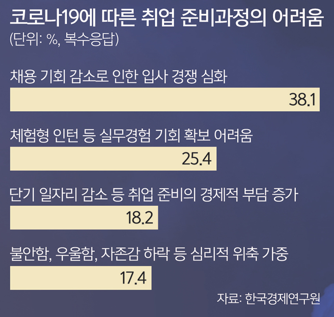 코로나19로 급변한 채용 환경이 청년세대를 압박하고 있다. 기업들이 채용 전형을 바꾸고 문턱을 높이면서 취업준비생들은 새 환경에 적응해야 하는 이중고를 안게 됐다. 첫 사회 진출이 늦어질수록 양질의 일자리에 안착할 확률은 줄어든다. 그만큼 생애 소득이 적어지고, 계층·세대 간 격차도 더 벌어질 수밖에 없다. 고학력을 기반으로 좋은 일자리를 얻어 ‘인생 역전’이 가능했던 과거 세대의 공식은 청년들에게는 꿈같은 얘기가 됐다.