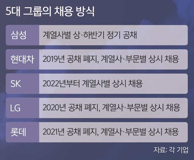 4일 재계에 따르면 국내 5대 기업 중 정기 공채를 유지한 곳은 삼성뿐이다. 2019년 현대차가 공채를 폐지한 것을 시작으로 지난해 LG도 상시 채용으로 전환했다. 올해는 롯데가 상반기부터 공채 대신 상시 채용을 도입했다. SK는 올해 상반기 공채를 진행하지 않고 내년부터 상시 채용을 도입한다는 계획이다.