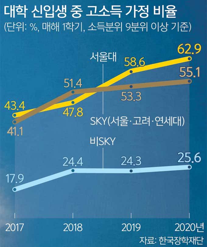 ‘SKY’ 신입생 중 고소득층 자녀 비율은 매년 증가 추세다. 서울대·고려대·연세대 신입생 중 부모의 월소득 인정금액이 9분위(949만원) 이상인 고소득 가정 출신은 2017년 41.4%에서 2018년 51.4%, 2019년 53.3%를 거쳐 지난해 55.1%까지 늘었다. 서울대는 고소득 가정 출신 신입생 비율이 2017년 43.4%에서 지난해 62.9%로 3년 새 19.5%포인트 높아졌다.