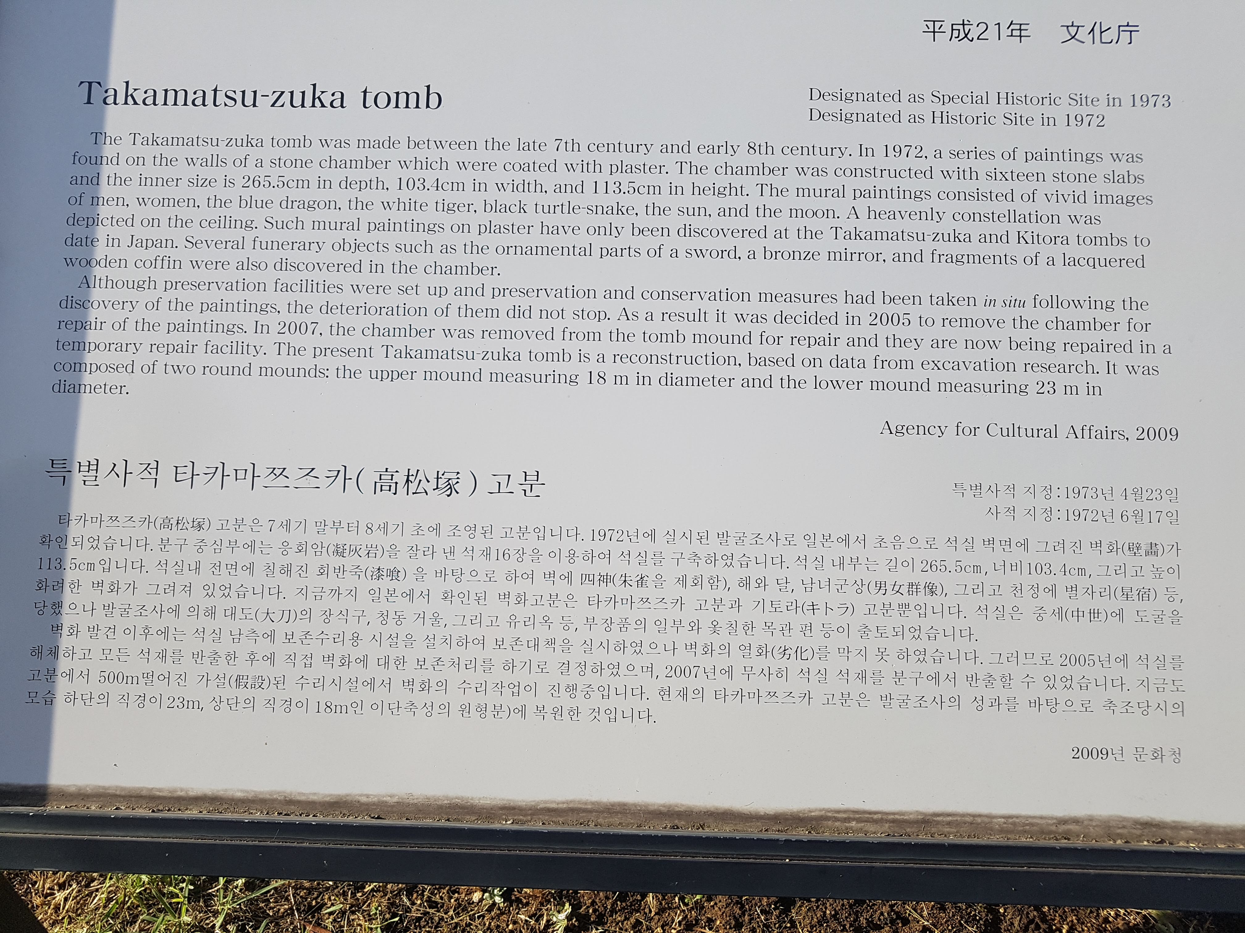 이 고분 아래 쪽에는 '성수(星宿)의 광장'이라는 이름의 별자리 공원이 조성돼 있다. 이 별자리 공원은 고분 석실 천장에서 발견된 북극성과 28개의 별로 이뤄진 별자리를 그대로 본 딴 것이다. 1300여년 전 아스카 시대 사람들이 바라보았던 하늘의 모습이 지금도 그대로 현대인의 머리 위에 펼쳐져 있다. 차이가 있다면 현대인보다는 아스카 사람들이 더 자주 하늘을 올려다 봤다는 사실이리라.