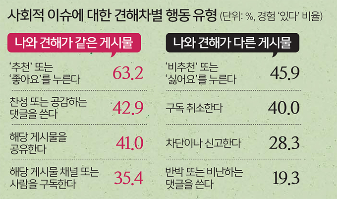 정덕현 대중문화 평론가는 “문화적으로 취향이 같아서 즐기는 건 괜찮지만, 정치처럼 세상을 여러 측면에서 바라봐야 하는 사안에서 자신의 취향에만 맞는 정보를 습득하는 것은 위험하다”고 경계했다.