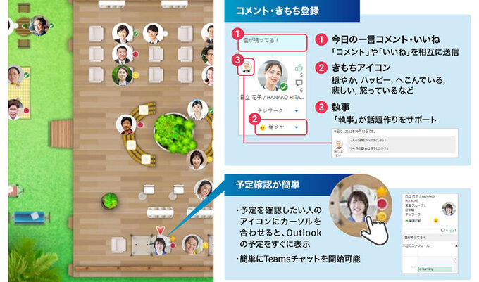 시스템 개발사인 히타치솔루션·크리에이트는 이런 기업들이 활용할 가상 오피스 서비스를 출시했다. 사용자들이 심리적 안정을 쉽게 느낄 수 있도록 온천 여관, 캠핑장 같은 디자인을 적용하고 직원들의 얼굴 사진에 ‘아, 바쁘다’, ‘배고프다’ 등 농담 같은 코멘트를 달아 친근한 분위기를 조성한다.
