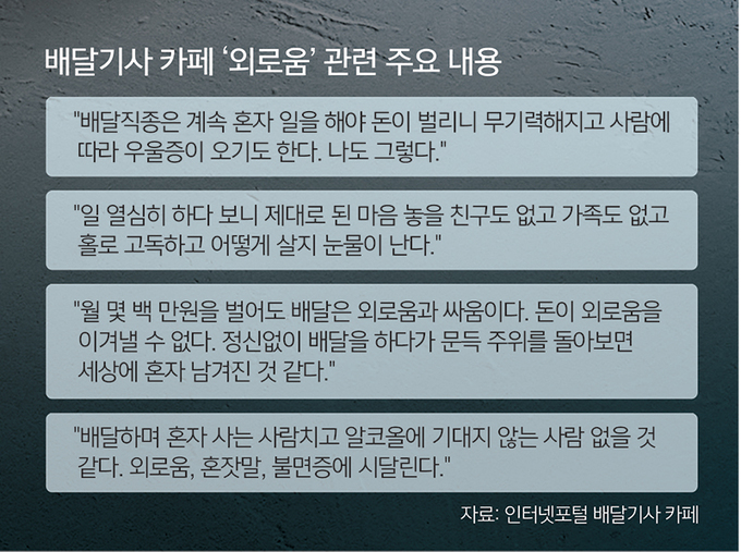 업무 특성상 홀로 일할 수밖에 없는 플랫폼 노동자도 매 순간 외롭진 않아도, 전혀 외롭지 않은 날은 없다. 음식점 배달 요청과 손님의 실시간 후기 사이에서 배달라이더는 디지털 감시를 당하는 수준이다. 배달기사가 모인 인터넷포털 카페에서는 외로움을 토로하는 글을 쉽게 발견할 수 있다. ‘하루에 10시간씩 일하고 와도 집에 반기는 사람이 없다‘, ‘길바닥에서 혼잣말하는 자신에게 현타(현실자각 시간) 온다’, ‘배달의 유일한 낙이던 신곡 재생도 질린다’는 내용이다.