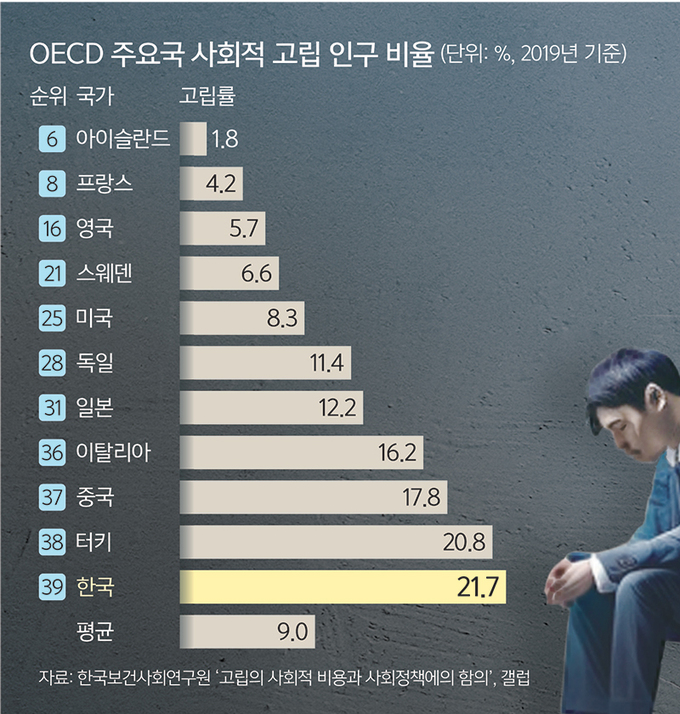 한국보건사회연구원이 지난해 발간한 ‘고립의 사회적 비용과 사회정책에의 함의’에 따르면 타인과 유의미한 교류가 없는 국내 사회적 고립 인구는 2021년 기준 인구의 6.0% 정도인 약 280만명으로 추산된다. ‘곤란한 일이 있을 때 의지하고 도움을 구할 친구·친지가 없다’고 답한 국내 사회적 지지체계가 없는 인구는 2019년 기준 21.7%로 경제협력개발기구(OECD) 가입국 중 가장 높은 수준이다. 보고서는 지지체계의 부족이 행복 수준 저하로 직결된다고 지적한다. 사회적 고립감은 1인 가구 증가, 신종 코로나바이러스 감염증(코로나19) 이후 일상화된 물리적 거리두기, 디지털 전환 등으로 커졌다.