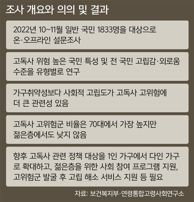전문가들도 경제적 문제와 사회적 유대 문제 2가지에 초점을 두고 각 세대에 맞는 정책을 수립해야 한다고 제언한다. 김윤태 고려대 교수(사회학)는 “정책의 혜택을 받는 수요자들을 대상으로 욕구조사 등을 해서 정책을 설계하는 게 좋다”며 “청장년층의 경우 경제활동 지원, 노년층의 경우 공동체 생활 지원 등이 적합할 수 있다”고 했다.